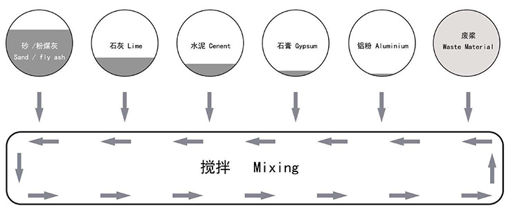 料漿、膠結料、石膏和鋁粉都分別通過(guò)相應自動(dòng)計量稱(chēng)計量,后在攪拌機內高速攪拌,澆注到模箱后進(jìn)行氣泡梳理。整個(gè)體系由 PLC 系統進(jìn)行自動(dòng)控制,保證工序的精確和高效。